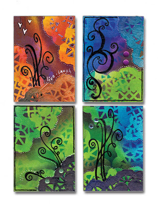 Jeg hører rykter om at ATC'ene har kommet frem dit de skal, så da kan jeg legge dem ut her også. Jeg laget en serie på 4, ved å bruke stazon, kakeservietter og stemplene til Aud. Herlige farger, ikke sant?The ATC's I sent to the mini swap I hosted have arrived, and I can show them to you in my blog. I made 4 ATC by using Stazon, doily and stamps from Auds Design. Love the colors :)